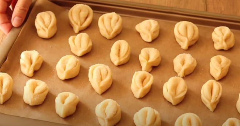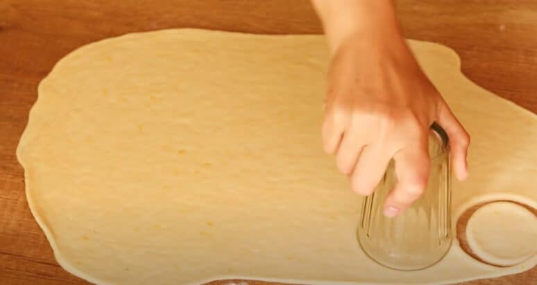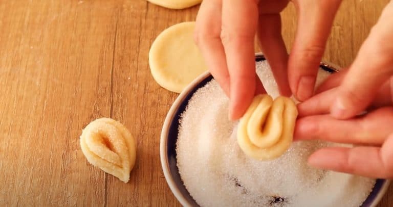 Вирізаємо склянкою кружальця, однією стороною вмокаємо в цукор, защипуємо краї, потім знову в цукор і ще раз защипуємо краї. Виходить черепашка.