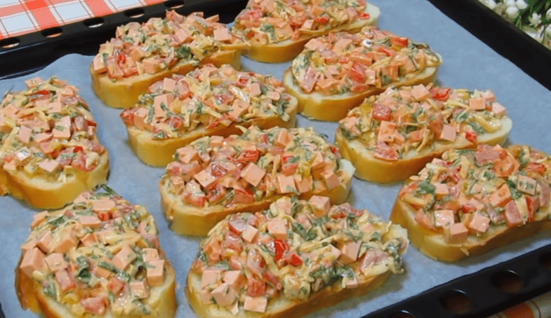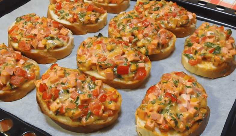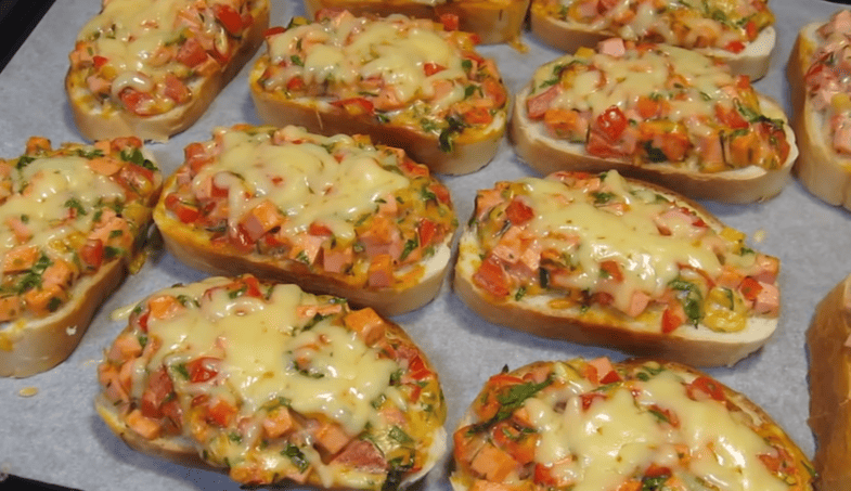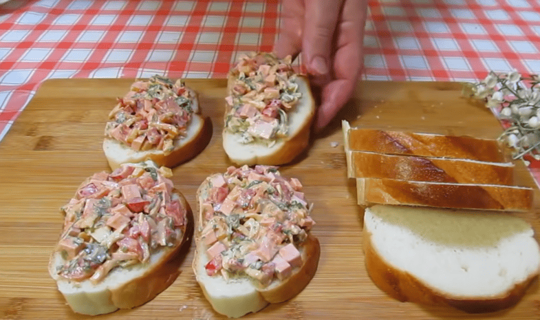 Викладіть начинку на хліб, і на деко. Запікайте бутерброди в духовці, розігрітій до 180 ° C протягом 10 хв.