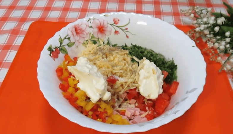 З’єднайте у мисці всі інгредієнти, перемішайте, заправте майонезом та гірчицею.