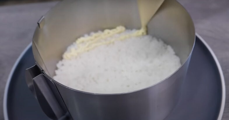 Діаметр мого кільця 16 см, першим шаром салату кладу відварений рис, солю, поливаю сіточкою із майонезу.