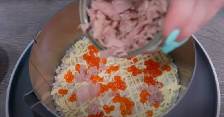 Тоді ікра і тунець, поливаю сіточкою із майонезу.