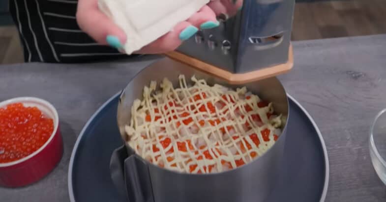 Тоді натираю варені яєчні жовтки, поливаю сіточкою із майонезу. І кладу ікру.