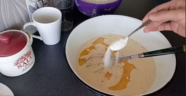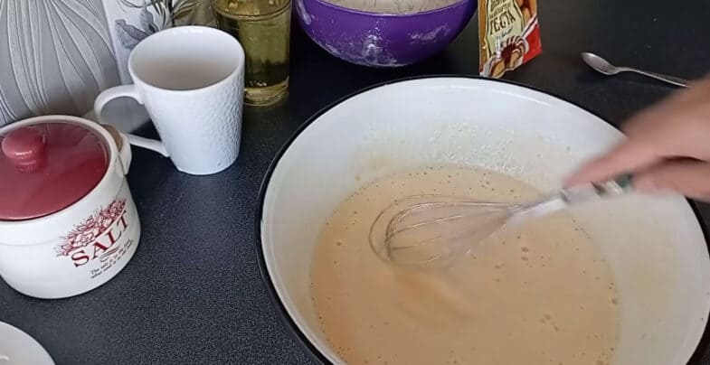 Всі інгредієнти мають бути кімнатної температури. До яєць додаю цукор, взбиваю вінчиком. Далі додаю щіпку солі, молоко і продовжую взбивати (потрібно щоб цукор повністю розчинився)