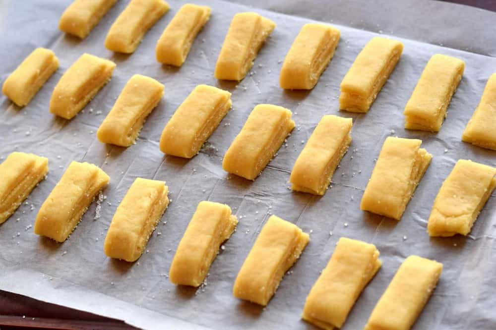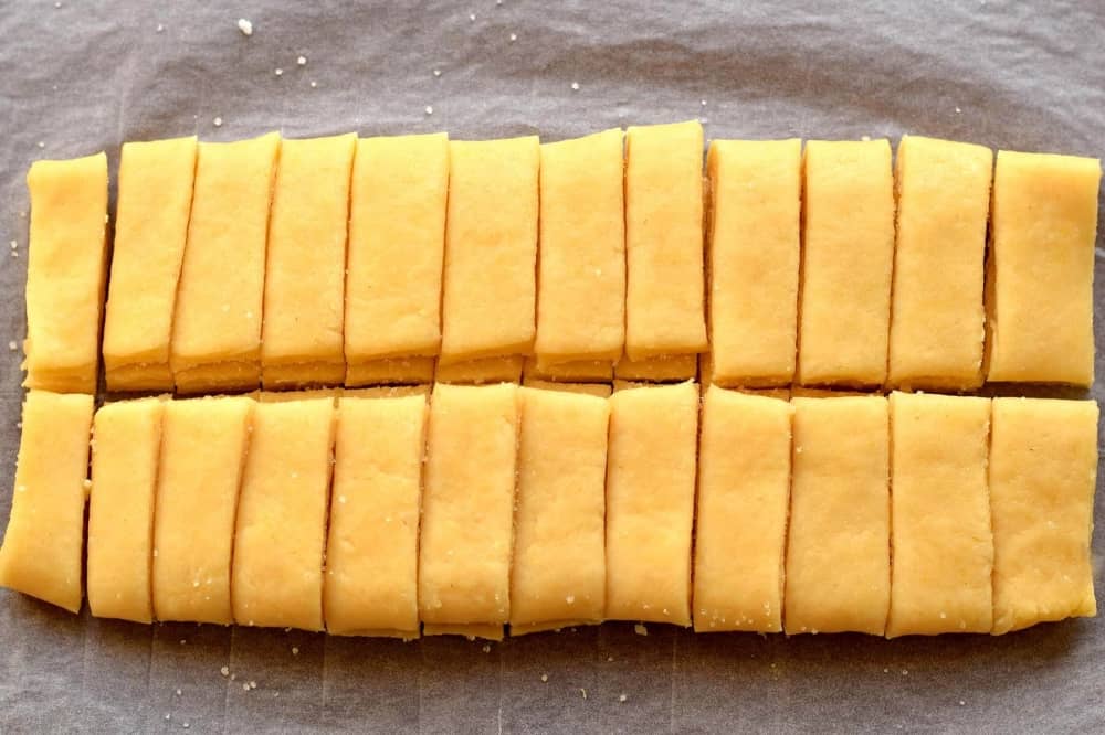 Отриманий тришаровий прямокутник тіста розріжте вздовж на дві половини, після поперек на тонкі порційні палички.