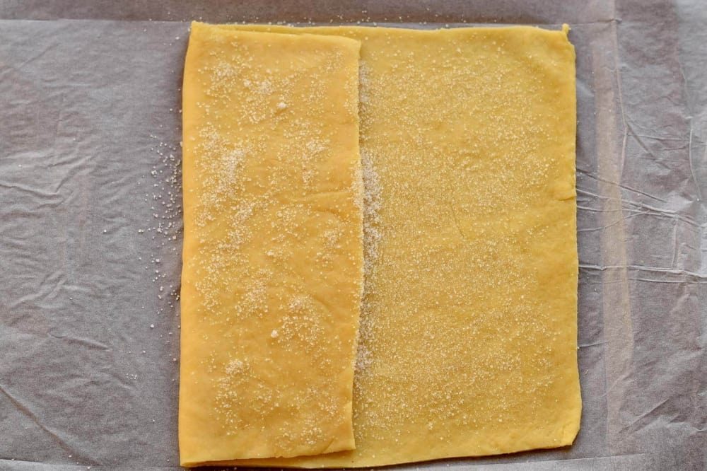 Одну сторону тіста складіть до половини, присипте її цукром. Потім накрийте другою половиною тіста.