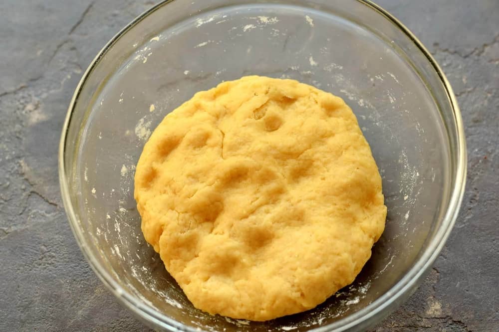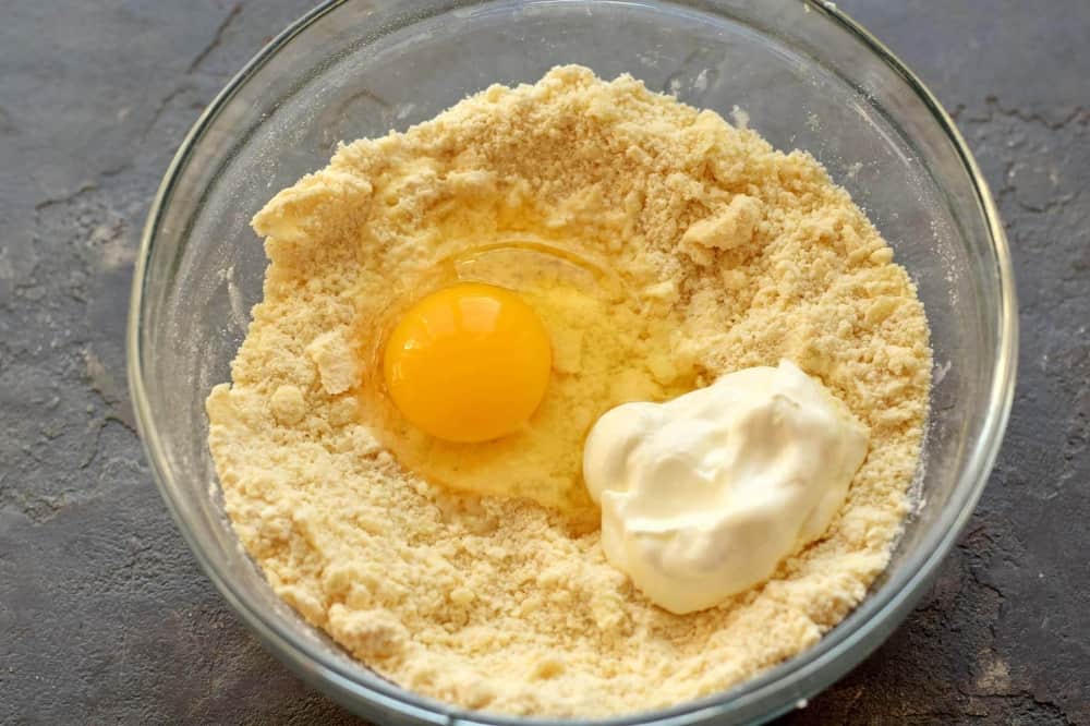 Потім вбийте яйце і додайте густий йогурт. Спочатку все перемішайте ложкою, потім руками замісіть густе тісто. Воно не повинно липнути до рук, бути м’яким. Його текстура дуже схожа на пісочне тісто.