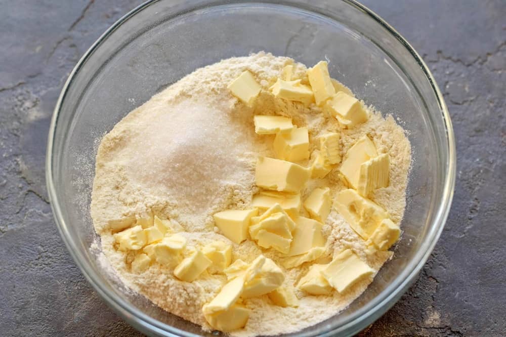 Борошно просійте через сито разом із розпушувачем, змішайте із цукром. Вершкове масло за 30 хвилин до приготування дістаньте з холодильника, щоб воно стало м’якшим. Наріжте його на шматочки, додайте в муку і ретельно перемішайте руками, роблячи дрібну крихту.