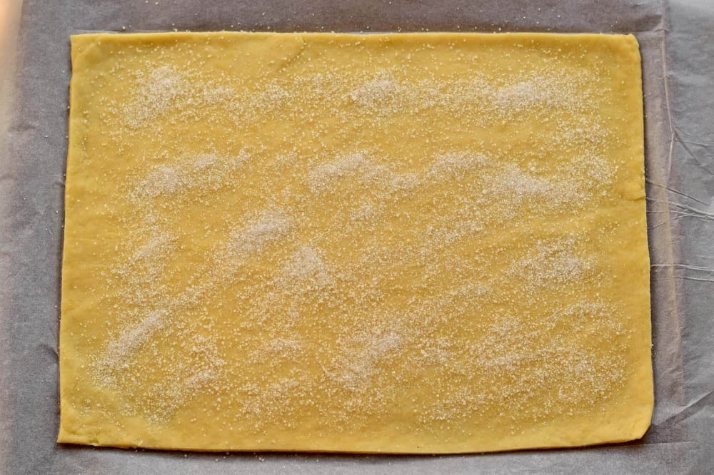 Пергаментний папір злегка присипте мукою, викладіть тісто, потім розкачайте його качалкою в тонкий прямокутний пласт. Тісто присипте цукром по всій поверхні.