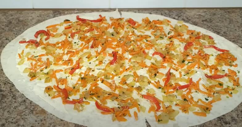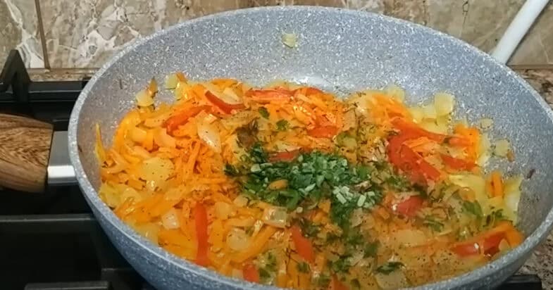 На сковорідці розігріваю олію та обсмажую до прозорості порізану кубиками цибулю. Додаю моркву порізану смужками, обсмажую все декілька хвилин до м’якості моркви. Додаю перець також порізаний соломкою, солю та обсмажую 3 хвилини. Перчу, додаю зелень, перемішую. Охолоджую начинку.