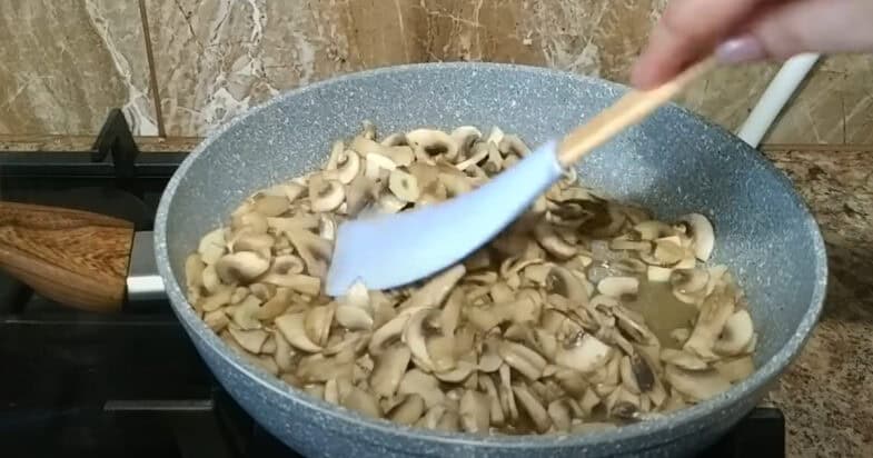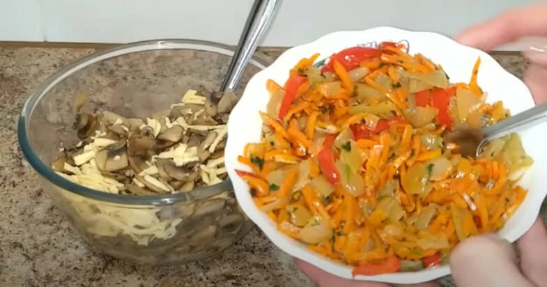 Перекладаю гриби у миску і охолоджую, тоді змішую з тертим сиром. Дві начинки готові.
