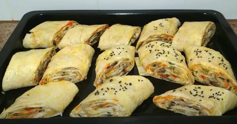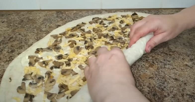 Зверху кладу другий лаваш, змащую майонезом та викладаю грибну начинку. Закручую усе разом у рулет. Роблю таких два однакових рулети.