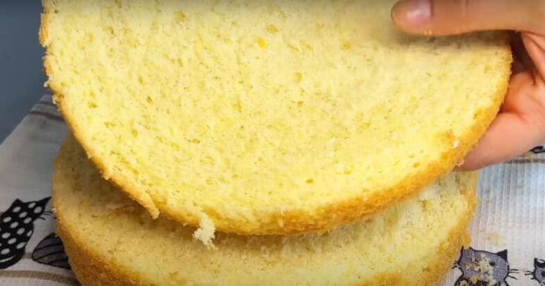 Форму діаметром 21 см застеляю пергаментом і виливаю усе тісто. Відправляю у духовку при температурі 170 градусів на 30-40хвилин. Бісквіт охолоджую, розрізаю горизонтально на 3 частини.