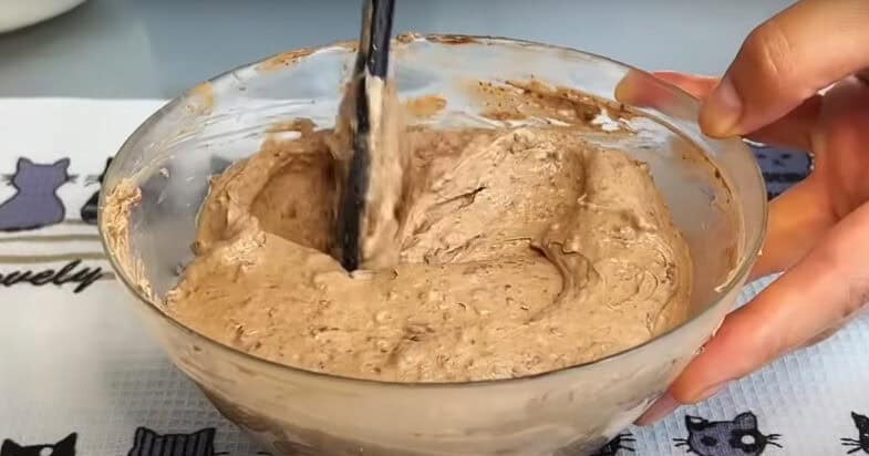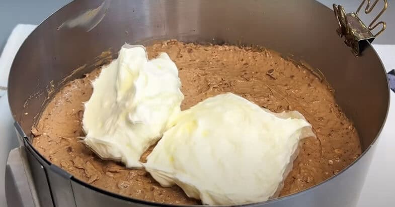 Перекладаю 400 г крему в окрему миску. Додаю розтоплений і вже не гарячий шоколад, перемішую до однорідності. Також додаю какао і перемішую. Накриваю 2 крема харчовою плівкою і кладу у холодильник.