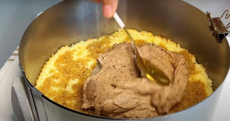Заварюю каву кип’ятком з цукром і залишаю охолоджуватись до кімнатної температури. Просочую кавою усі бісквіти. Викладаю спочатку шар шоколадного крему.