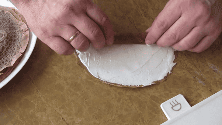 Кожен млинець промажемо вершками, товщиною 2-3 мм.