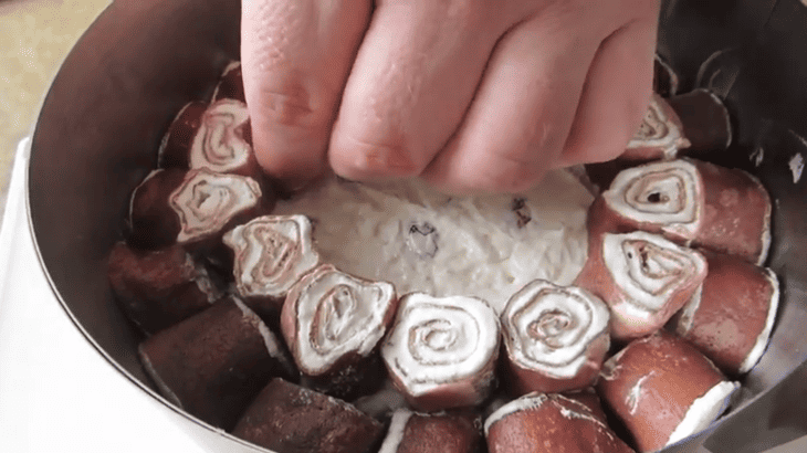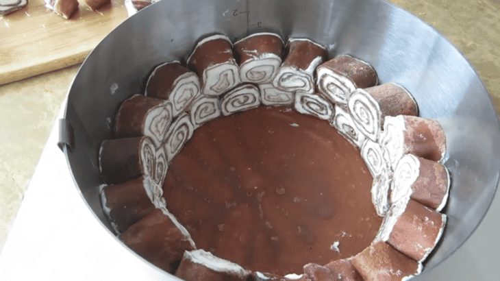 Усередині по стінках форми викладаємо млинці (шайби) у два ряди.