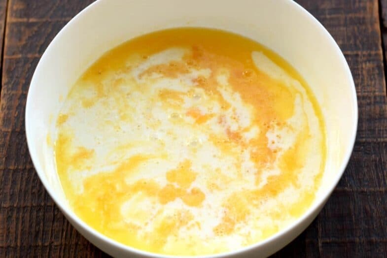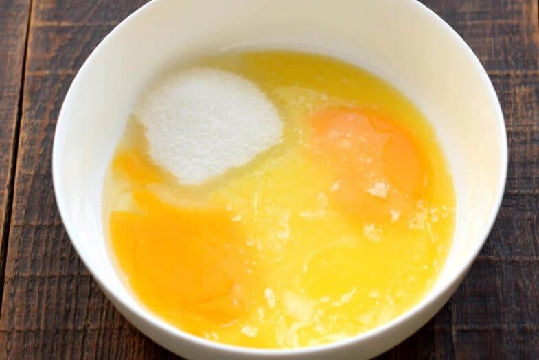 У глибоку ємність вбийте яйця, всипте цукор. Вершкове масло розтопіть до рідкого стану, остудіть його, влийте в яєчну суміш.