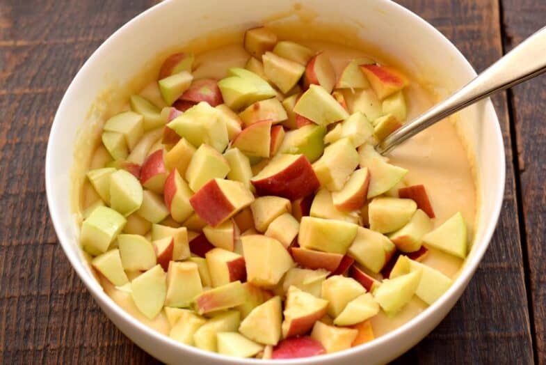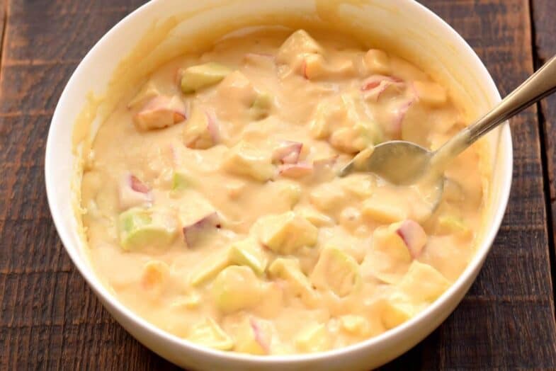 Яблука розріжте навпіл, видаліть внутрішню частину з насінням та прожилками. М’якуш разом із шкіркою наріжте великими кубиками, закиньте в тісто.