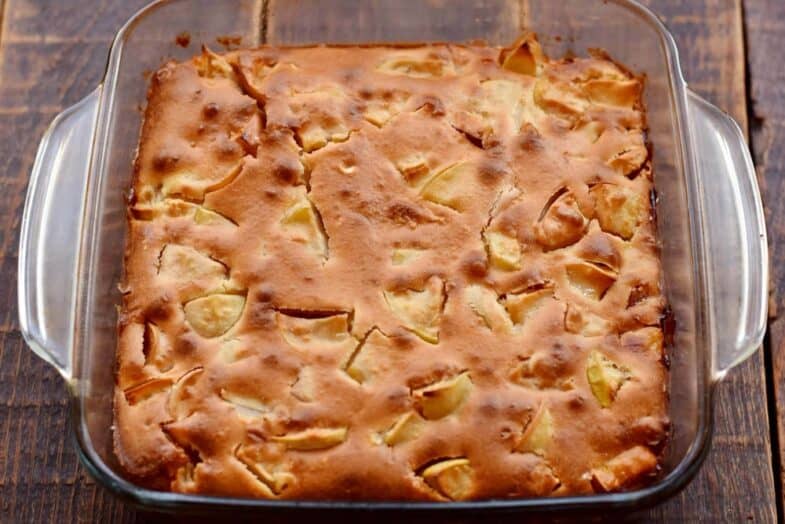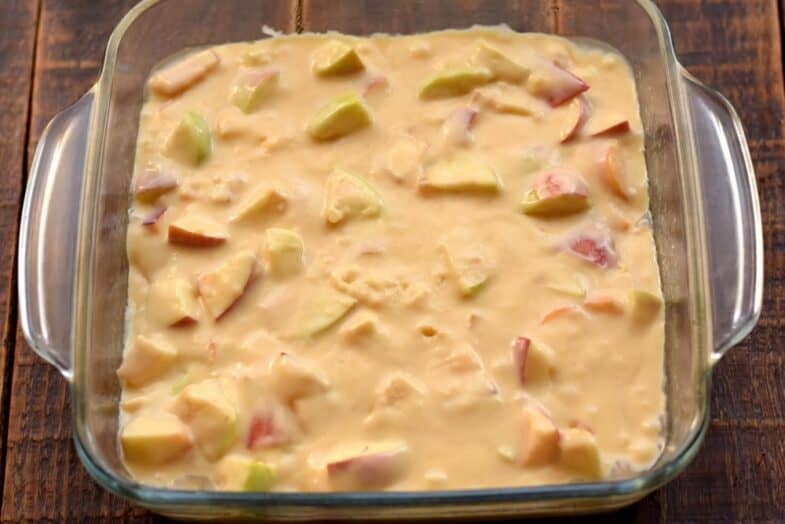 Прямокутну або квадратну форму для запікання змастіть олією, вилийте тісто з яблуками, поверхню розрівняйте лопаткою.