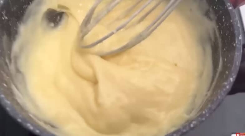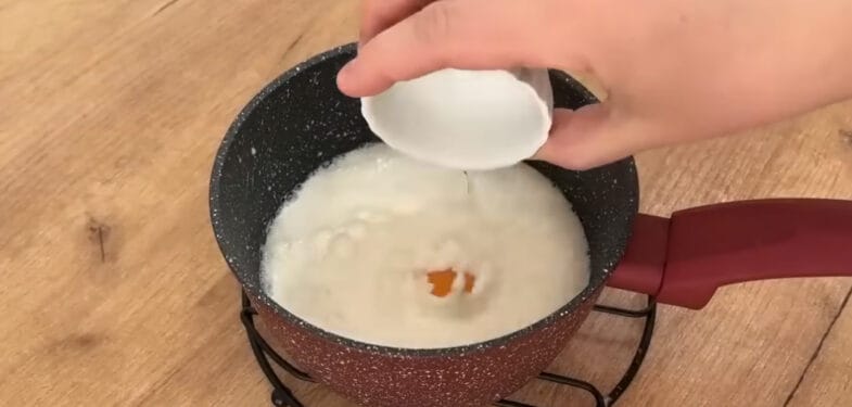 У сотейник вливаємо молоко, додаємо жовток, кукурудзяний крохмаль, ванільний цукор та цукор.