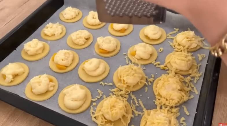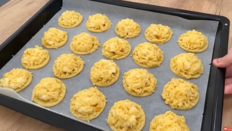 Натираємо холодну грудку тіста на тертці, стружку викладаємо зверху.