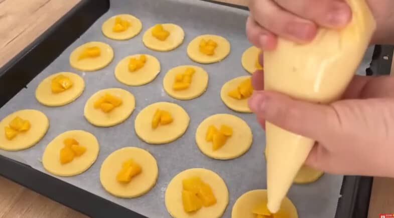 Нарізаємо дрібно персики, кладемо всередину кожного кружечка.