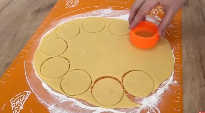 Другу частину розкочуємо в круглий пласт завтовшки 5-6 мм. За допомогою стаканчика чи форми вирізаємо кружечки з тіста. Викладаємо їх на деко, застелене пергаментом.