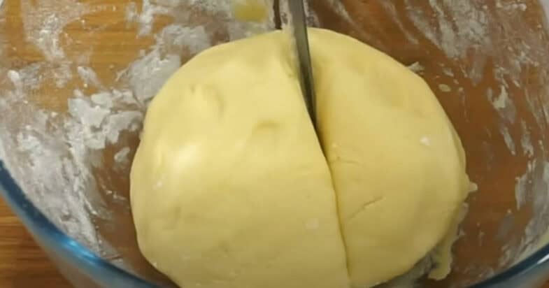 У миску кладу м’яке масло, додаю цукор, сметану і яйце, перемішую міксером до однорідності. Всипаю борошно та розпушувач, замішую тісто руками. Ділю на 2 рівні частини.