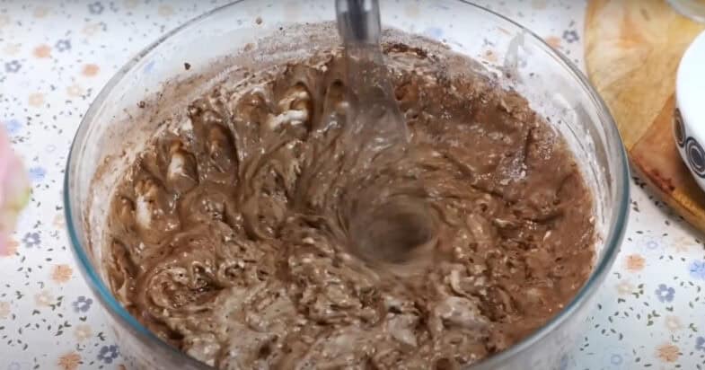 Збиваю яйця міксером з дрібкою солі та цукром до пишної та світлої маси. Вливаю олію, кефір, перемішую. Просіюю борошно, какао і розпушувач, замішую міксером до однорідності.