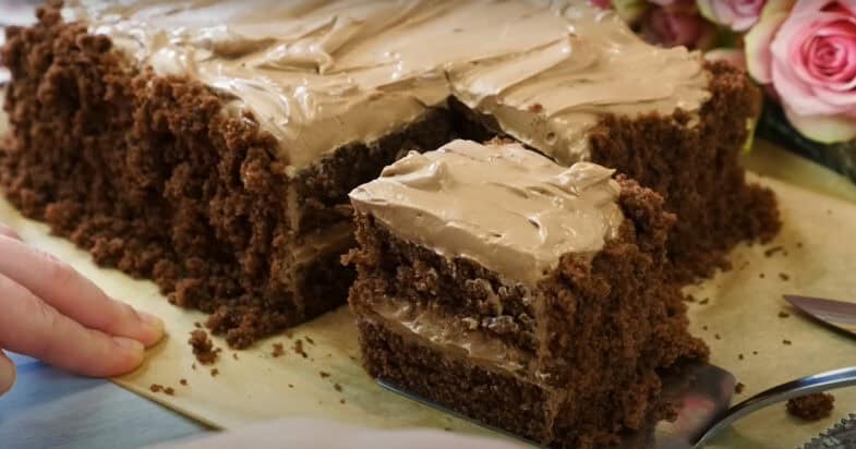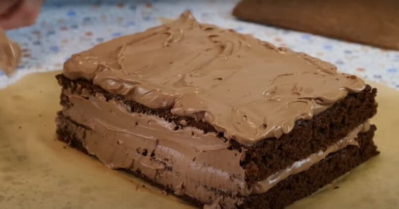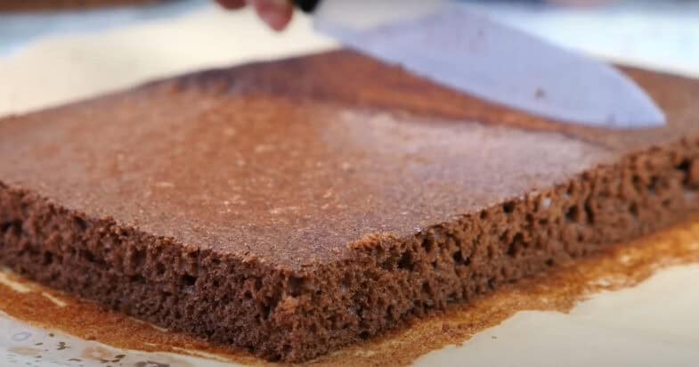 Корж охолоджую, обрізаю краї, які перетворю на крихту для прикрашання. Розрізаю на 2 частини.
