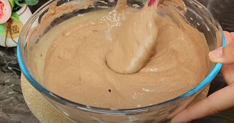 Збиваю яйця міксером з дрібкою солі та цукром до пишної та світлої маси. Вливаю олію, молоко, перемішую. Просіюю частинами борошно, какао, крохмаль і розпушувач, замішую лопаткою до однорідності.