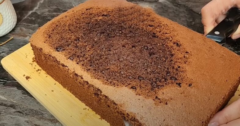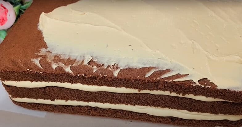 Форму 28 на 18,5 см застеляю пергаментом і виливаю усе тісто. Відправляю у духовку при температурі 180 градусів на 40-45 хвилин. Корж охолоджую, розрізаю горизонтально на 3 частини.