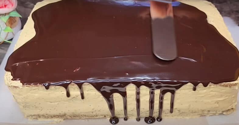 У каструлі на вогні розтоплюю шоколад з молоком та вершковим маслом до однорідності. Виймаю торт з холодильника та поливаю зверху глазур’ю.