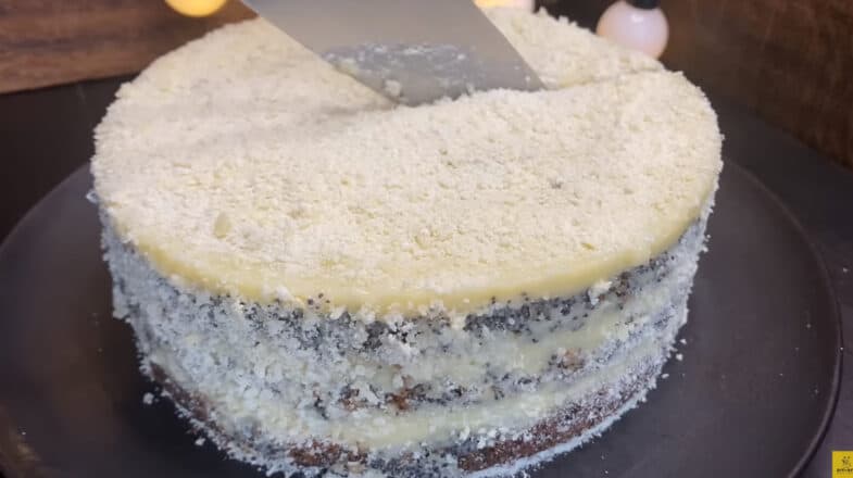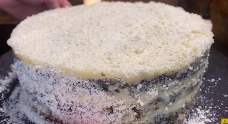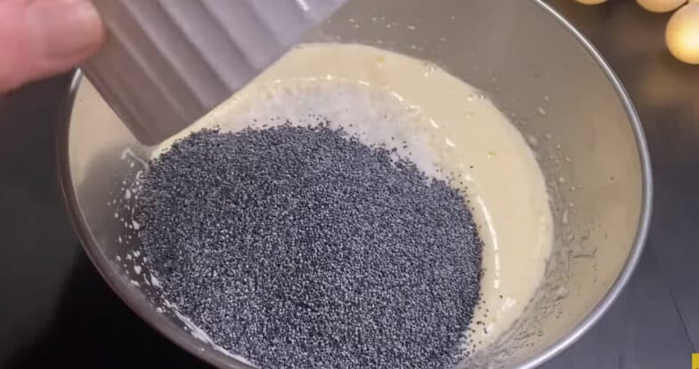 Додаю сметану, кокосову стружку і мак (попереднього я його промила і просушила). Продовжую збивати.