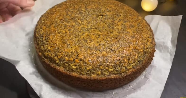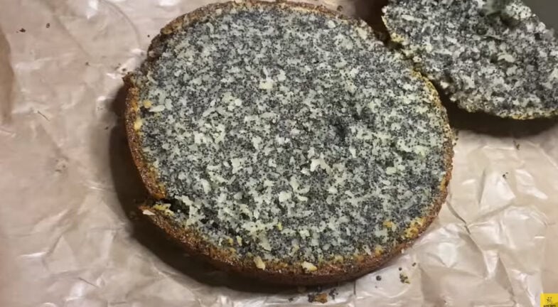 Коли бісквіт охолонув, ділю його на 2 частини .