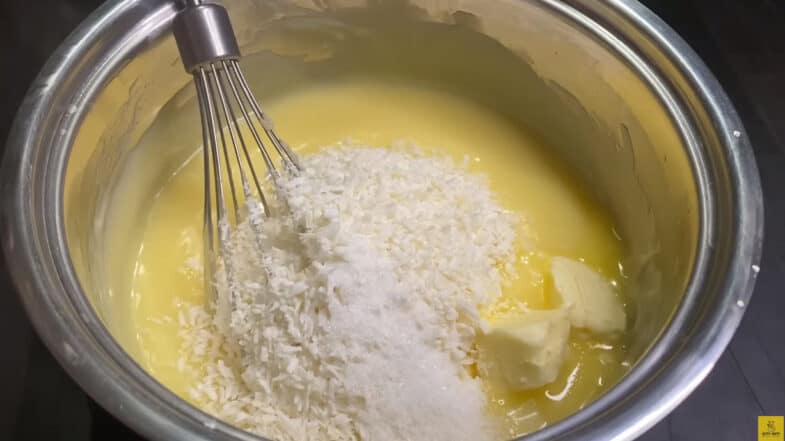 Додаю вершкове масло, кокосову стружку і ванільний цукор та добре перемішую до повного розчинення масла.