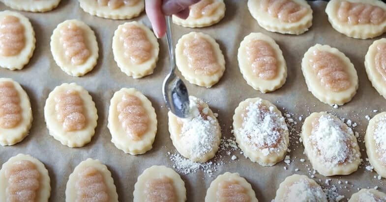Тепер тісто розкачую у пласт товщиною 6 міліметрів, вирізаю печиво. Викладаю на форму для випікання застелену пергаментом. Поверх кондитерським мішком викладаю яблучний джем. Посипаю крихтою. Випікаю в добре розігрітій до 180 градусів духовці приблизно 15 хвилин.