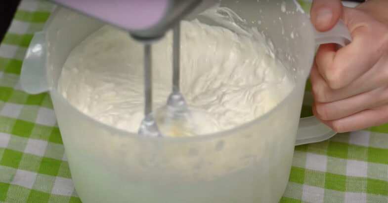 Збиваю у мисці міксером холодні вершки з вершковим сиром і цукром до пишності і однорідності.