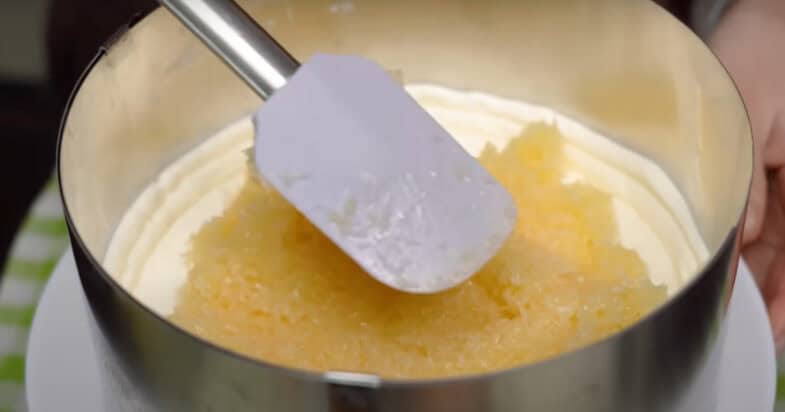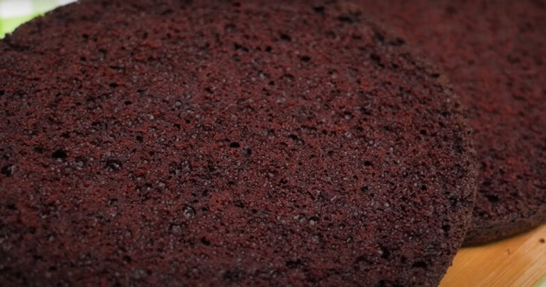 Форму діаметром 22 см застеляю пергаментом і виливаю усе тісто. Випікаю у розігрітій духовці до 180 градусів 25 хвилин під фольгою. Знімаю фольгу, зменшую до 170 градусів і випікаю ще 25 хвилин. Бісквіт охолоджую, розрізаю горизонтально на 3 частини.