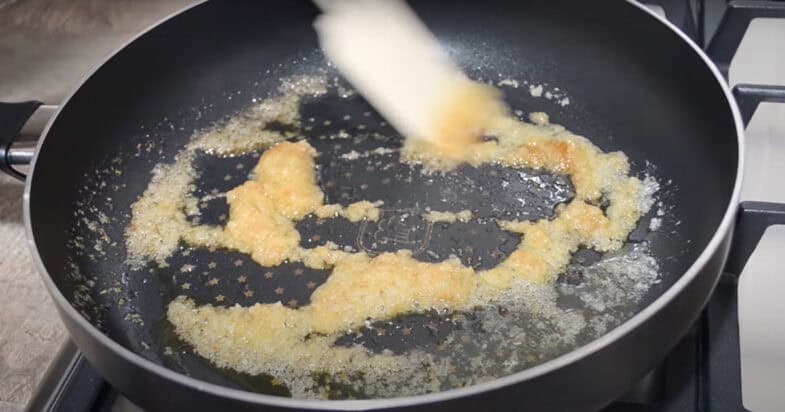 Розтоплюю вершкове масло у сковорідці до бульбашок, всипаю цукор і розмішую до повного його розчинення. Сиром має стати карамельного кольору.