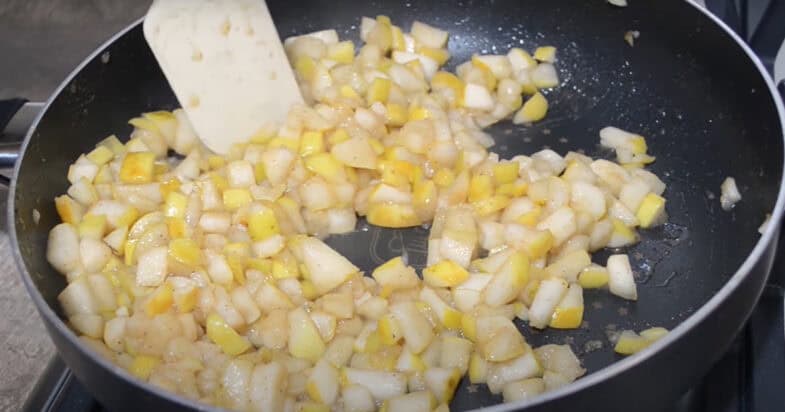 Яблука очищаю від шкірки і нарізаю кубиками, всипаю у сковорідку до сиропу. Тушкую, постійно помішуючи, 10-15 хвилин. Додаю корицю через 5 хвилин. В кінці дода крохмаль і добре перемішую. Перекладаю яблука і миску, накриваю в контакт харчовою плівкою та залишаю до повного охолодження.