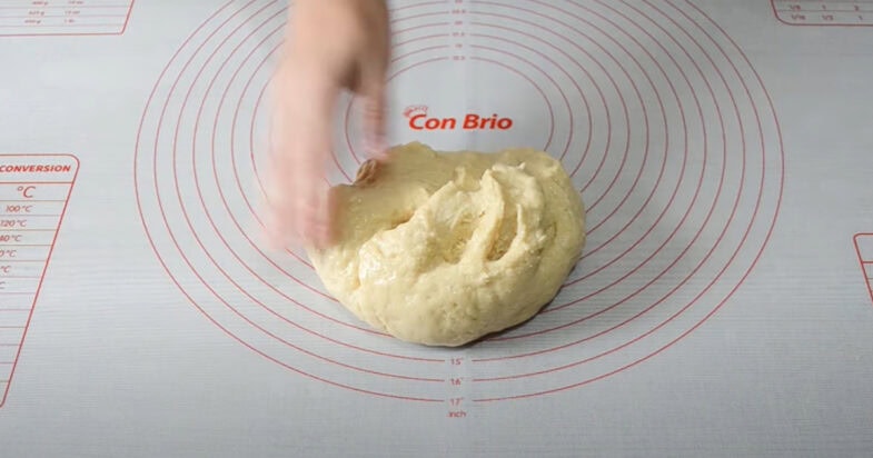 Тоді до опари додаю решту цукру і ванільний цукор, сіль, м’яке вершкове масло, яйця і перемішую. Всипаю решту борошно і замішую тісто. В кінці замішуючи тісто руками додаю олію. Накриваю тісто у мисці харчовою плівкою та залишаю на 40 хвилин. Потім знову обминаю і знову залишаю на 30 хвилин під плівкою.