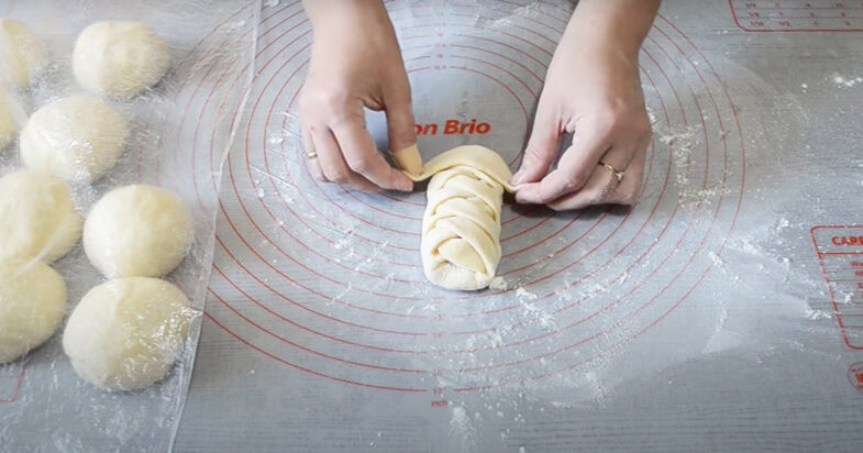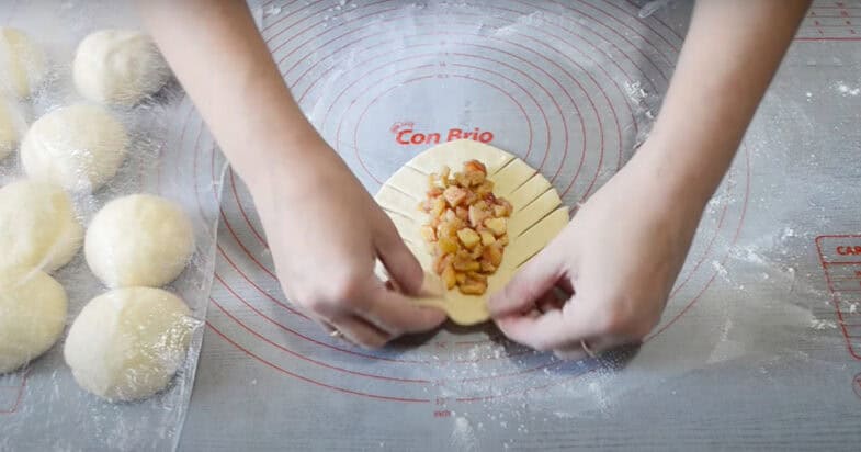 Ділю тісто на 14 частин приблизно по 70 г, формую кульки, накриваю їх плівкою на 10 хвилин. Тоді розкачую коржики, викладаю начинку по середині. Роблю невеличкі надрізи з обох сторін на тісті шириною по 1 см.