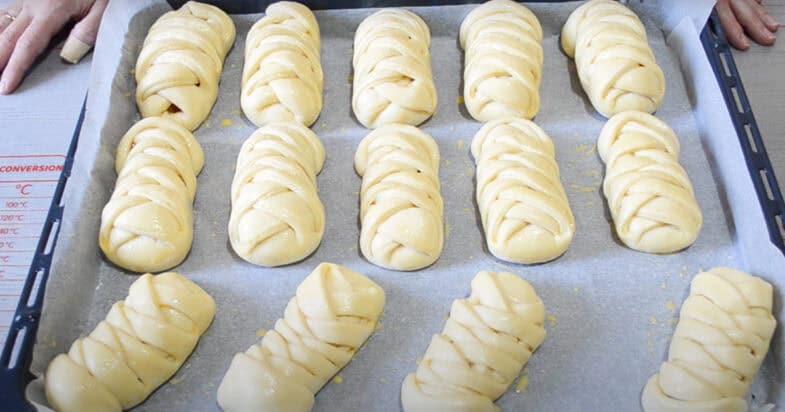 Викладаю булочки на форму для випікання застелену пергаментом. Накриваю плівкою та залишаю відпочити на 15-20 хвилин. Змащую збитим жовтком з водою. Випікаю у розігрітій духовці до 180 градусів приблизно 20-25 хвилин.