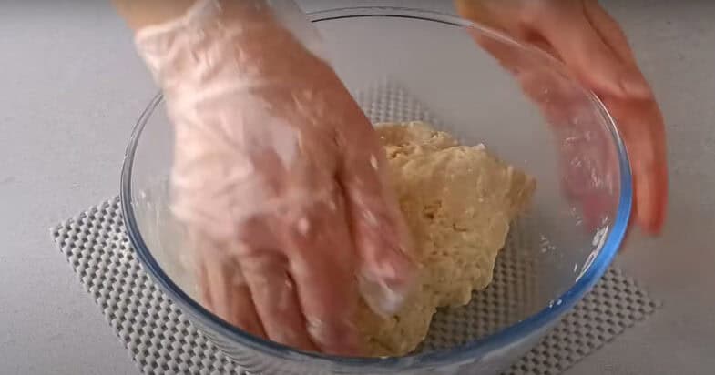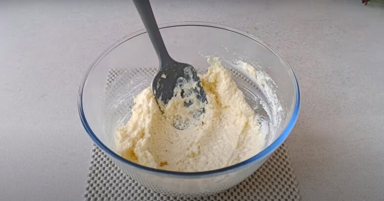 Всипаю борошно та розпушувач та замішую тісто. Ставлю в холодильник, поки приготую начинку.