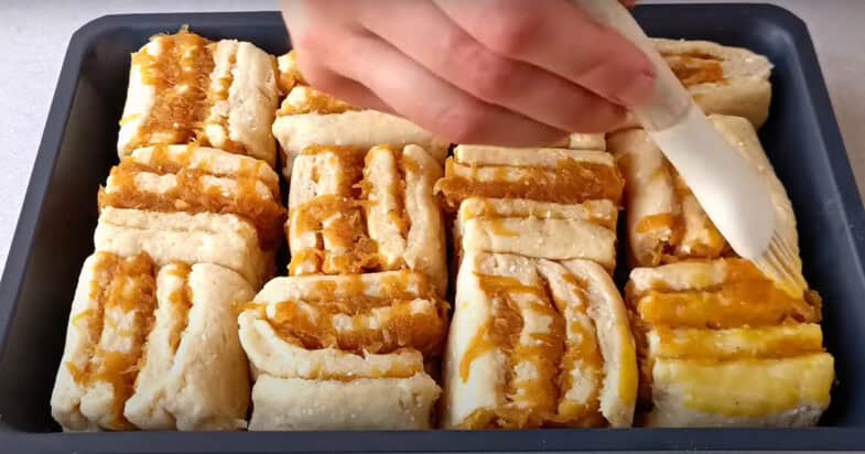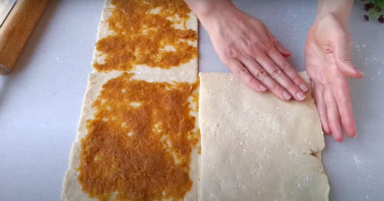 Тісто розкачую у прямокутний пласт, нарізаю на 4 прямокутника. Викладаю начинку, розподіляючи її по всіх пластах. Складаю всі чотири пласти один на одного.