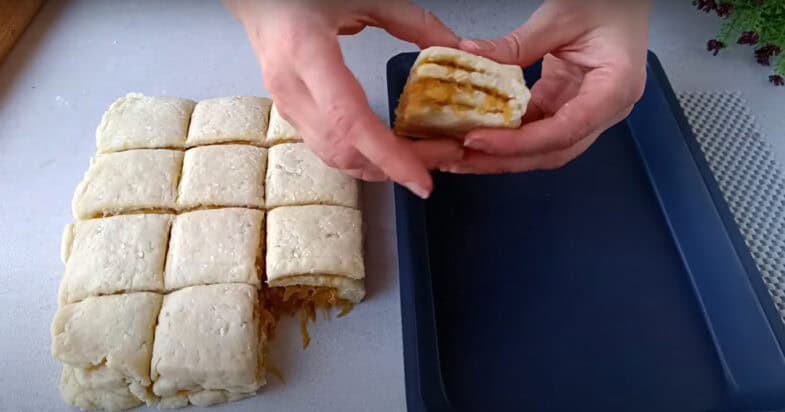 Розрізаю цей один пласт на квадратики. У форму 28 на 19 см, висотою 3 см. викладаю булочки.