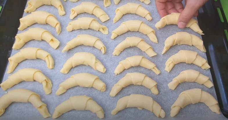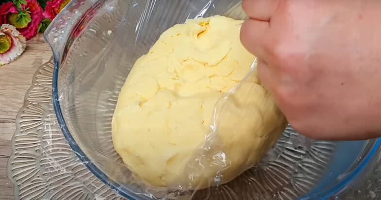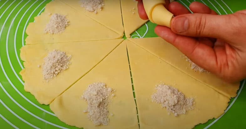 Ділю тісто на шматочки, формую кульки, накриваю плівкою, щоб не обвітрювались. З кульок розкачую коржики, вирізаю трикутники.