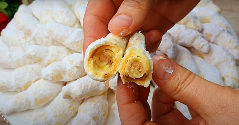 Для начинки змішую борошно з розтопленим маслом, цукром, ваніліном, корицею, цукровою пудрою. Викладаю начинку на краї трикутників та закручую у рогалики.