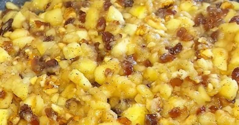 З яблук зчищаю шкірку та нарізаю на маленькі кубики. Сковороду змащую вершковим маслом і викладаю яблука, додаю цукор, корицю, лимонний сік і змішую. Потім всипаю родзинки, подрібнені горіхи і змішую, охолоджую.